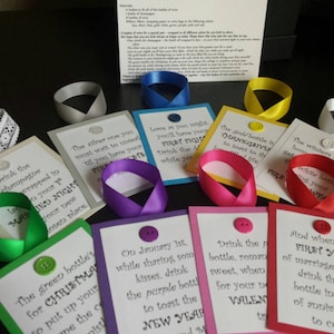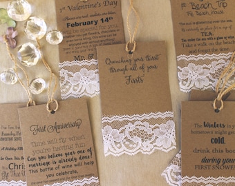 Bridal shower wine poem labels. Wedding Wine Poems - Etsy Marriage Milestone Wine Labels, Wedding Wine Poems, Bridal Shower Gift, Custom Engagement Gift, Wedding Milestone Poems, Unique Wedding Gift Ad by GardeniaLabels Ad from shop GardeniaLabels GardeniaLabels From shop GardeniaLabels. 5 out of 5 stars (4,108) $ 16.99. More like this Add to Favorites ... First Year of Marriage Wine Basket Poem - Adventures of Dre We hope that you are always as happy as today, please share this wine just the way we say. First, drink the champagne, the bottle all wrapped in lace, on your first married night in your new chosen place. The silver one you must wait to unseal, until you have your first guests over for a meal. Love as you might, you'll have your first fight… Bridal Shower Wine Tags - Etsy Bridal Shower Wine Poems for Wine Basket- 8 HOLIDAY THEMED tags- First xmas/Anniversary/New Year/ V-Day/4th/ St.Pats/Halloween/Thanksgiving 4EverNAlways (1,735) $8.00 FREE shipping Bridal Shower Favor Tags, Sip Sip Hooray, Printable Favor Tag Template, Editable, Champagne or Wine Bottle Tags, Blush Pink Floral, VWC95 VineWedding (8,137) $3.85 $5.50 Wine Bottle Labels for First Milestones First Anniversary ... Jun 2, 2014 - Set of 6 wine bottle labels for special landmarks or anniversaries. Each label features a special anniversary poem and. These labels make great gifts for weddings, bridal showers or bachelorette parties. The couple can enjoy a new bottle of wine on each anniversary. HOW IT WORKS